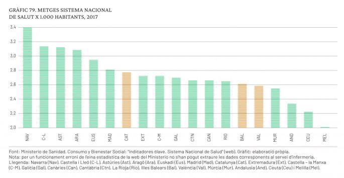 Novament les diferències són abismals entre les comunitats més ben dotades (Navarra) i les que menys (Melilla), amb una diferència d’1’39 metges per cada 1.000 habitants (un 69% més) entre l’una i l’altra.